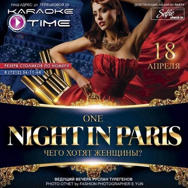 В субботу, 18 апреля Karaoke Time устраивает One night in Paris. С наступлением весны каждый жаждет новых эмоций, как во французских романах, наполненных чарующими повествованиями. Поэтому клуб и решил распахнуть свои окна в Париж с изысканными ароматами и погрузить всех в атмосферу парижской ночи и головокружительных ритмов. Интрига заключается в том, что в эту ночь ведущий вечера Руслан Тулегенов предстанет в образе Парфюмера и сможет открыть двери души прекрасных дам. Куда ещё сходить на выходные узнаете тут.